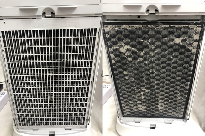 2) 필터 세이버를 빼면 먼지가 많이 쌓여 있는 탈취필터를 확인을 할수가 있는데요. 필터를 빼도록 합니다.▼